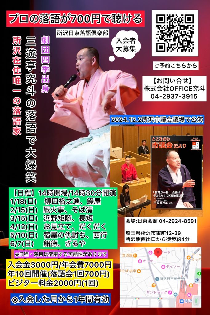 所沢市在住の落語家三遊亭究斗が新たに立ち上げたサークルです。入会者大募集!